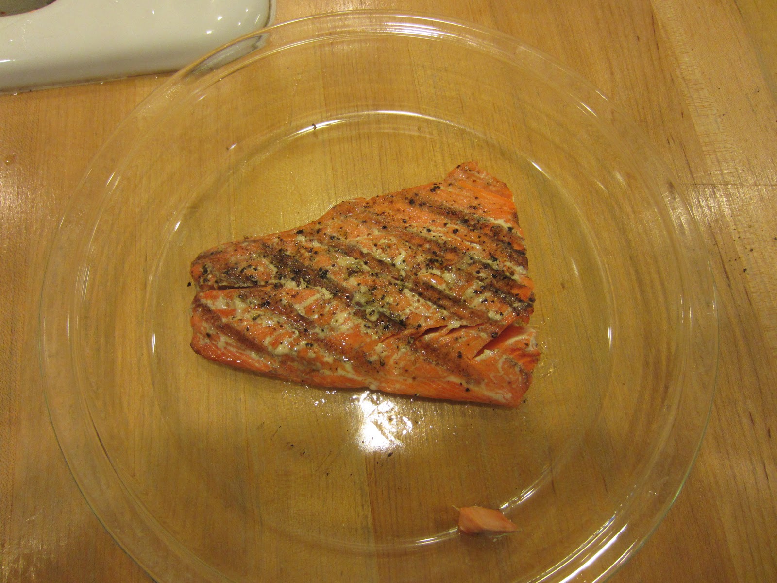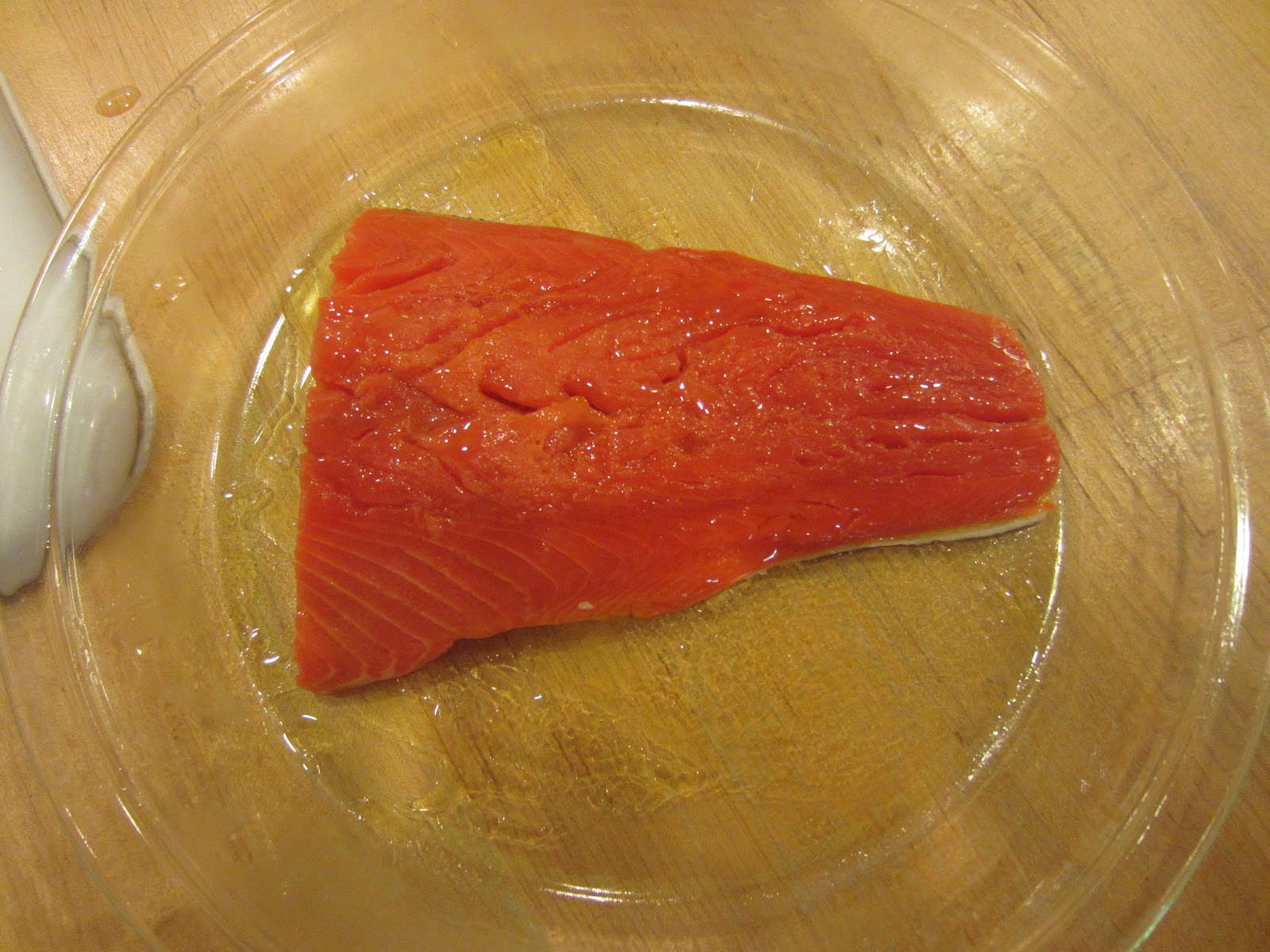 When the sauce is close to done, wash the salmon in cold running water and check for bones by running your finger down the center of the fleshy side. Cook the filet by bushing with olive oil and placing on a grill, skin-side down, on medium-high heat. After about five minutes, turn the filet flesh-side down and carefully remove the skin and discard. Cook for about another five minutes. The flesh should just begin to separate with a fork when it’s done. Don’t overcook. You can also cook the salmon by pan frying in a couple of tablespoons of olive oil.