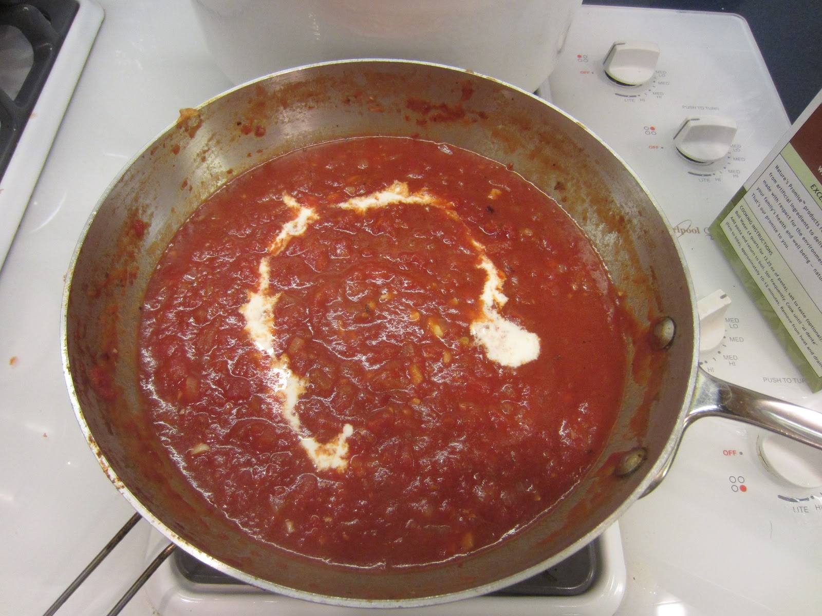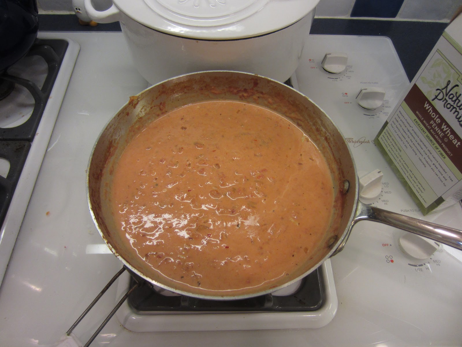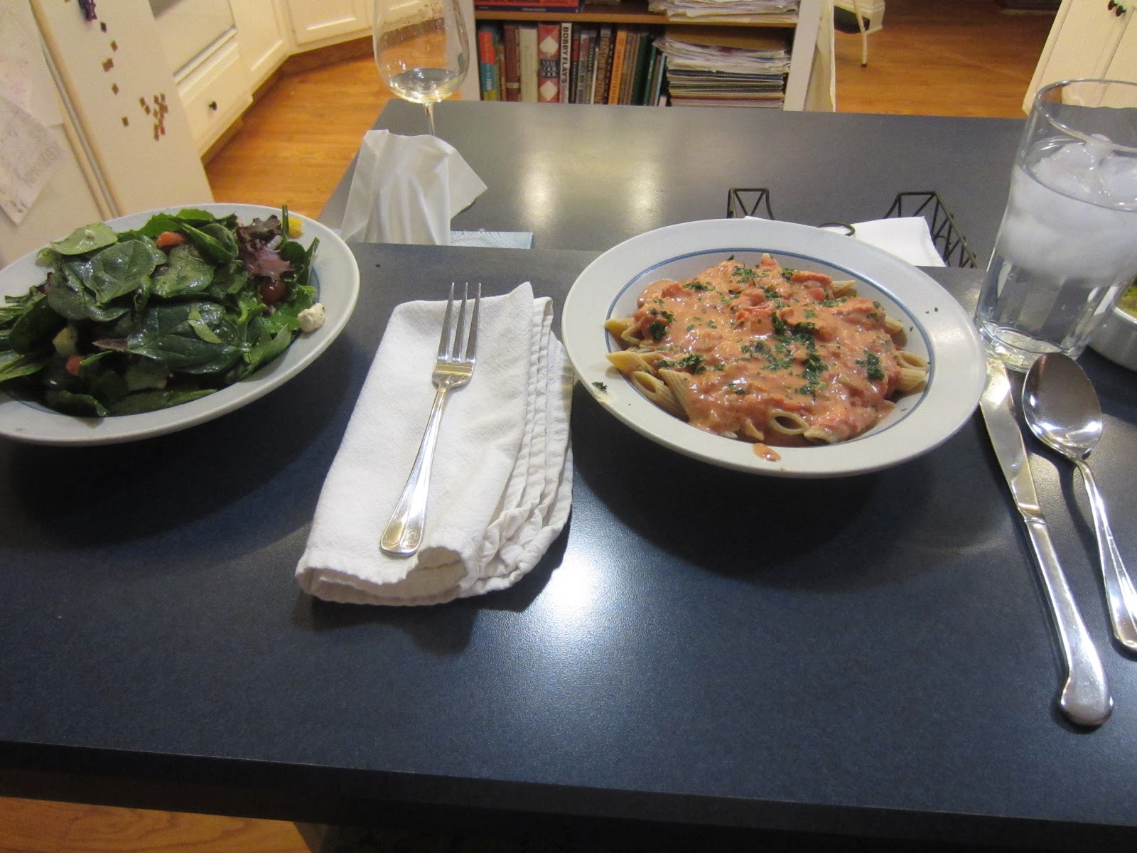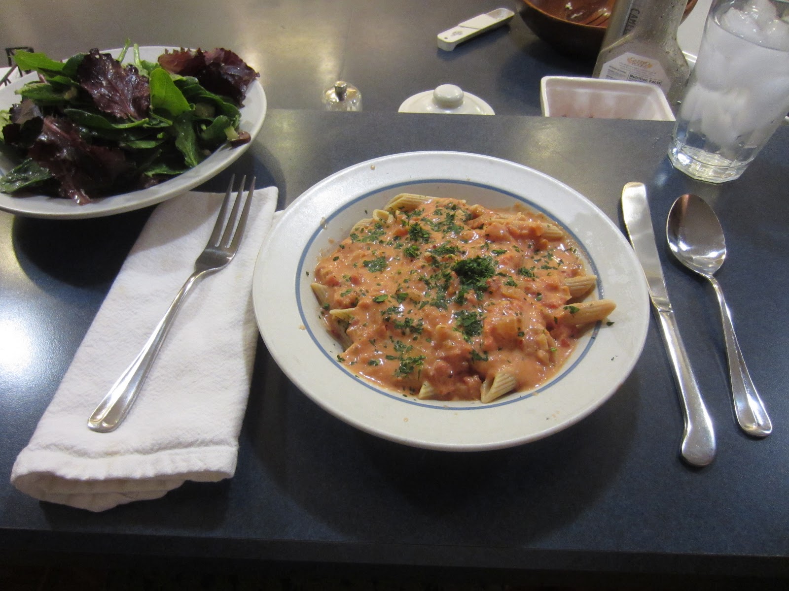 This was our dinner tonight. I reverse engineered this from two restaurants. The vodka sauce is from Mario and Luigi’s in State College, one of my favorite places to eat while in Happy Valley. At Al Mediterraneo in Hummelstown (sadly no longer in business), I had a dish that seemed to combine the vodka sauce with salmon and penne pasta. I tried it at home and voila! I have no idea what role the vodka plays in this. I asked the chef at Mario and Luigi’s and he swears it gives it a nice spicy bite. If nothing more, it’s a great conversation starter!